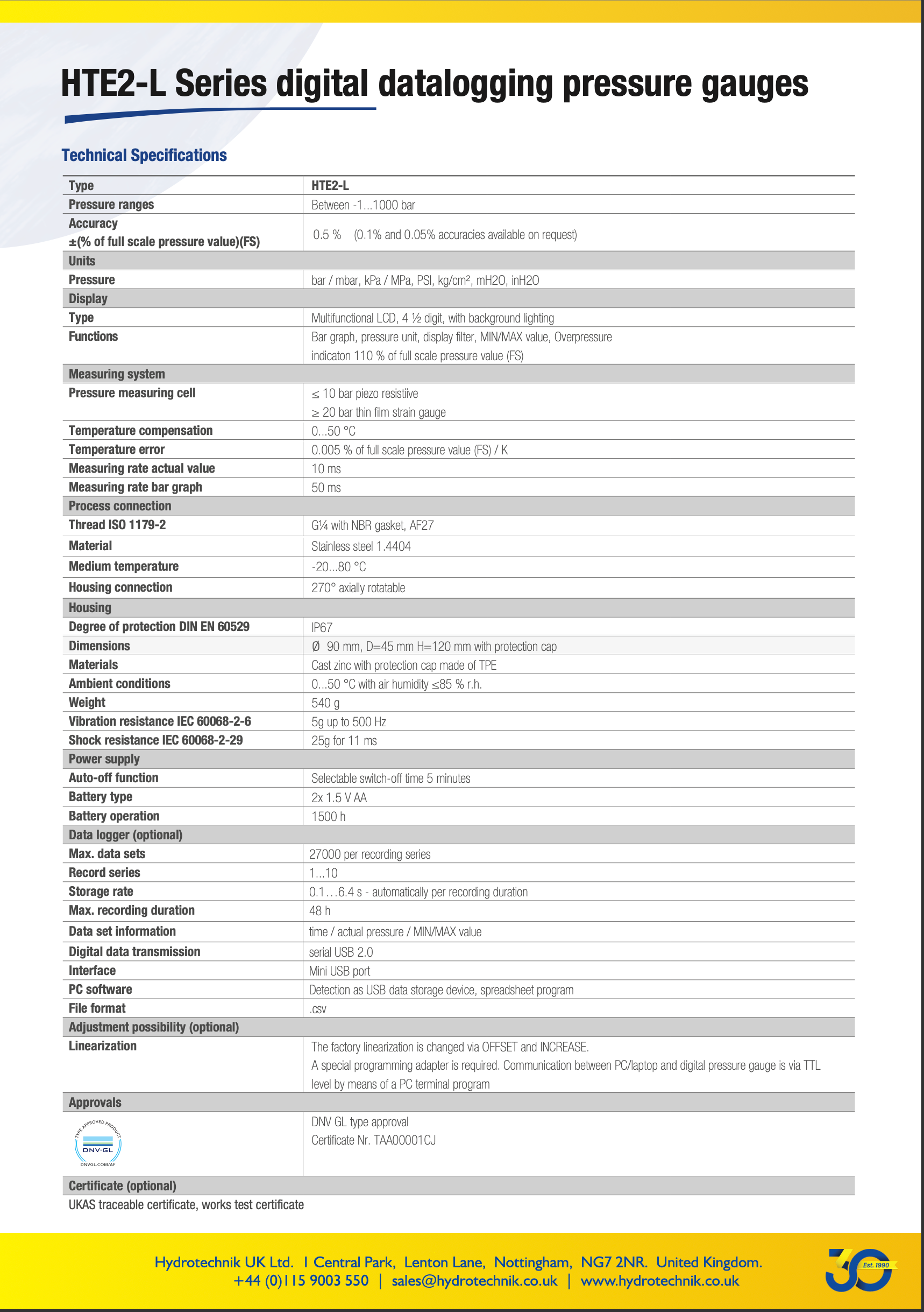 HTE2-L series digital datalogging pressure gauge. 0...1000 bar measuring range. 10 recordings up to 27000 records each. Automatic scan rate 100ms up to 6.4s (depending on test duration) 48 hours max. duration. Selectable bar, mbar, kPA, MPa, PSI, kg/cm, mH2O, inH2O units. G1/4" BSP male thread with captive seal. 2x 1.5V AA battery supply. Backlight. Resolution 0.1 bar, accuracy 0.5% FS. Rubber protection shroud. * Optional calibration certificates extra on request *
