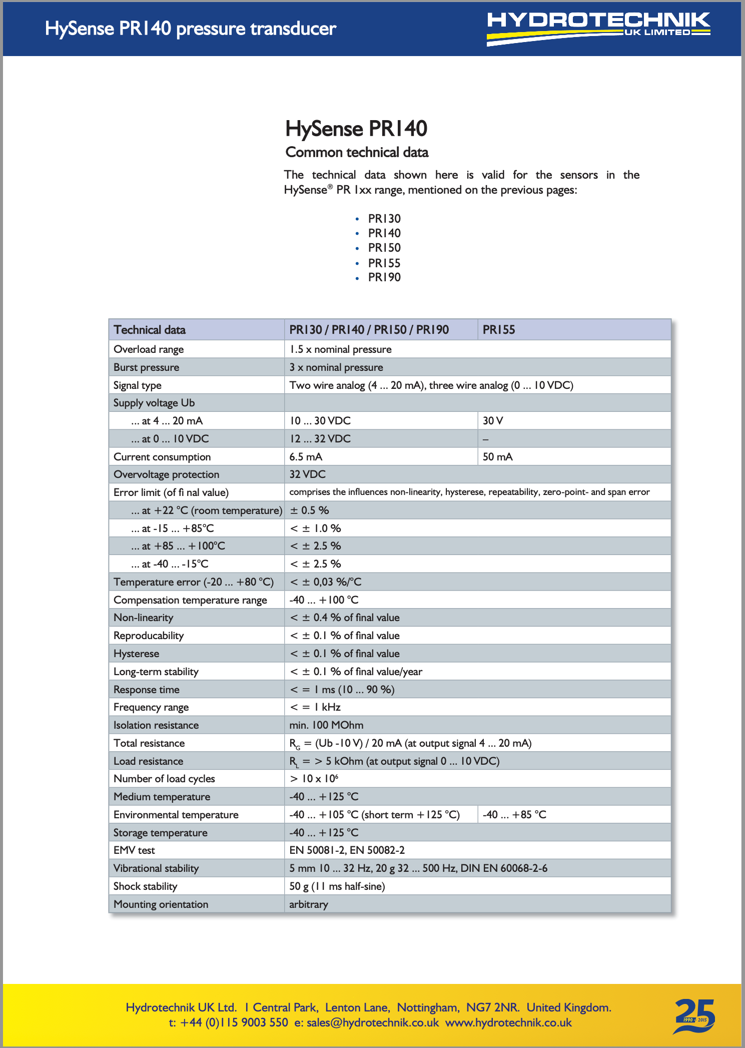 HySense PR140 Stainless Steel Pressure Transducer. 0.5% FS accuracy. 0-10V output. Hirschmann DIN cap electrical connection. G1/4"BSP male thread.